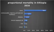 Tobacco use is the major single known risk factor for non-communicable diseases from the four listed main risk factors (diet, physical activity, and harmful use of alcohol).[53] NCDs are the leading cause of premature death and disability in Ethiopia accounts for about 42% of deaths, of which 27% are premature deaths before 70 years of age.[54] NCDs are estimated to account for 39% of all deaths in Ethiopia, while 71% in the world. Recently, the burden of these diseases is rising rapidly among populations in the low-income countries.[55]
