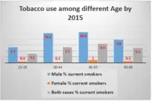 From the Table above, Tobacco relatively used in rural 4.3% than urban 3.9% for both sexes current smokers. The percentage of male's current smokers among 45-59 age group 10.4%, 1% Female's and both sexes’ current smokers are 6.5% and the use of tobacco among this age group shows increasing when compared to others age group in 2015. The overall tobacco use among adults age (15+) were 4.2% in 2015 and declined to 4% in 2016. Smoking prevalence of males were high according to both residences and among all age group when compared to females.