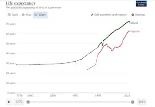 According to the recently conducted national survey in 2024, Uganda's population stands at 45.9 million.[1] Health status is measured by some of the key indicators such as life expectancy at birth, child mortality rate, neonatal mortality rate and infant mortality rate, maternal mortality ratio, nutrition status and the global burden of disease. The life expectancy of Uganda has increased from 39.3 in 1950 to 62.7years in 2021.[2] This is lower below the world average which is at 71.0 years.[3] The fertility rate of Ugandan women slightly increased from an average of 6.89 babies per woman in the 1950s to about 7.12 in the 1970s before declining to an estimate 4.3 babies in 2019.[4] This figure is higher than the world average of 2 and most world regions including South East Asia, Middle East and North Africa, Europe and Central Asia and America.[5] The under-5-mortality-rate for Uganda has decreased from 191 deaths per 1000 live births in 1970 to 41 deaths per 1000 live births in 2022.
