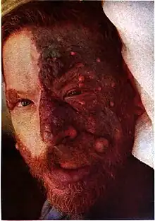 A hemangioma or haemangioma is a usually benign vascular tumor derived from blood vessel cell types. The most common form, seen in infants, is an infantile hemangioma, known colloquially as a "strawberry mark", most commonly presenting on the skin at birth or in the first weeks of life. A hemangioma can occur anywhere on the body, but most commonly appears on the face, scalp, chest or back. They tend to grow for up to a year before gradually shrinking as the child gets older. A hemangioma may need to be treated if it interferes with vision or breathing or is likely to cause long-term disfigurement. In rare cases internal hemangiomas can cause or contribute to other medical problems. They usually disappear by 10 years of age.[1] The first line treatment option is beta blockers, which are highly effective in the majority of cases. Hemangiomas present at birth are called congenital hemangiomas, while those that form later in life are called infantile hemangiomas.[2]