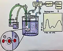 A 3-part differential cell counter uses Coulter's principle to find the size and volume of the cell. The sample is lysed and dissolved into an electrolyte solution in a container, which also holds a smaller container. The smaller container has two pumps running to and from its solution, one creating a vacuum and the other replacing the lost solution. The smaller container has a small hole (an orifice) near the bottom of the container. Coulter's principle is applied through the use of two electrodes. One electrode (the internal electrode) is within the smaller container, and the other (the external electrode) is outside of the smaller container but within the electrolyte/sample solution. As the vacuum draws the sample cells through the orifice, the cell momentarily causes electrical resistance to the current as it passes through the orifice. This resistance is recorded, measured, amplified, and processed which can then be interpreted by the computer into a histogram. The 3-part analyzer is able to differentiate between three types of white blood cells (WBCs): neutrophils, lymphocytes, and monocytes.[7]