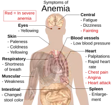 - ↑ Mikael, Mikael Häggström When using this image in external works, it may be cited as:Häggström (2009-04-13), English: Main symptoms that may appear in anemia. (See also Wikipedia:Anemia#Signs and symptoms). To discuss image, please see Template talk:Human body diagrams, retrieved 2018-04-11
