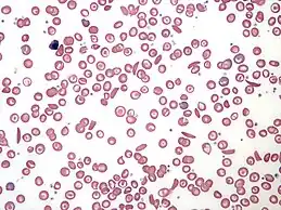 Blood smear of a patient with Thrombotic Thrombocytopenic Purpura (TTP). Notice that some red blood cells are nucleated. This is a characteristic finding in such blood smears. - Autoimmune hemolytic anemia (AIHA), in which autoantibodies react with self red blood cells and cause their destruction.[5] This disease is marked by increased extravascular hemolysis, with laboratory findings including increased lactate dehydrogenase and decreased or absent haptoglobin in both warm and cold AIHA, and positive Coombs test.[5] Clinically, jaundice or dark urine present in approximately one-third of the cases, and most of the symptoms are related to anemia.[5]