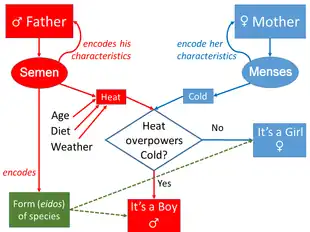 Scientists in Antiquity had a variety of ideas about heredity: Theophrastus proposed that male flowers caused female flowers to ripen;[26] Hippocrates speculated that "seeds" were produced by various body parts and transmitted to offspring at the time of conception;[27] and Aristotle thought that male and female fluids mixed at conception.[28] Aeschylus, in 458 BC, proposed the male as the parent, with the female as a "nurse for the young life sown within her".[29]