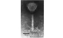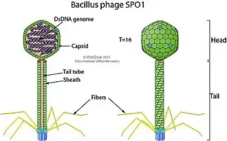 Schematic drawing of a Bacillus phage SPO1 virion of the genus Okubovirus, cross section and lateral view.