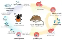A dixenous life cycle: the apicomplexan parasitic protist Babesia microti and its two different taxonomic hosts, the deer tick and the white-footed mouse.