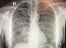 On physical exam, increased breathing rates, increased heart rates, and a low-grade fever 38.5o C (101.3o F) are common.[9][3] Listening to the lungs may reveal crackles in one or both lungs, often starting in the right middle lobe.[9][3] Imaging studies such as X-ray and CT imaging of the chest may reveal thoracic infiltrates that can be seen as opaque patches.[14][9][3] One distinct feature of HAPE is that pulse oximetry saturation levels (SpO2) are often decreased from what would be expected for the altitude. People typically do not appear as ill as SpO2 and chest X-ray films would suggest.[9][3] Giving extra oxygen rapidly improves symptoms and SpO2 values; in the setting of infiltrative changes on chest X-ray, this is nearly pathognomonic for HAPE.[3]