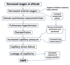 Though it remains a topic of intense investigation, multiple studies and reviews over the last several years have helped to elucidate the proposed mechanism of HAPE. The inciting factor of HAPE is the decrease in partial pressure of arterial oxygen caused by the lower air pressure at high altitudes (pulmonary gas pressures).[2][9][10] The resultant hypoxemia is then thought to precipitate the development of: