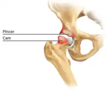 Cam impingement is created by the abnormal development of the femoral head-neck junction causing what has previously been described as a 'pistol-grip deformity'. This type of deformity is characterised by varying amounts of abnormal bone on the anterior and superior femoral neck at the head-neck junction (see fig. 6). The head-neck junction is at the base of the ball of the hip, where it joins the short neck, which in turn carries on downwards into the femur, or thighbone, itself. A bony protrusion or bump at the head-neck junction has been likened to a cam, an eccentric part of a rotating device. This leads to joint damage as a result of the non-spherical femoral head being forced into the acetabulum mainly with flexion and/or internal rotation. This may impart compression and shear forces to the articular cartilage, and may lead to labral tears and peeling away of the articular cartilage from the underlying bone, so-called cartilage delamination (see fig. 8).[9][10]