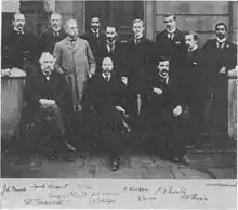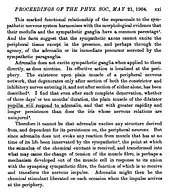 A new chapter was opened when Max Lewandowsky in 1899 in Berlin observed that adrenal extracts acted on the smooth muscle of the eye and orbit of cats—such as the iris dilator muscle and nictitating membrane—in the same way as sympathetic nerve stimulation.[27] The correspondence was extended by John Newport Langley and, under his supervision, Thomas Renton Elliott in Cambridge. In four papers in volume 31, 1904, of the Journal of Physiology Elliott described the similarities organ by organ. His hypothesis stands in the abstract of a presentation to the Physiological Society of May 21, 1904, a little over ten years after Oliver and Schafer's presentation:[28] "Adrenalin does not excite sympathetic ganglia when applied to them directly, as does nicotine. Its effective action is localized at the periphery. I find that even after complete denervation, whether of three days' or ten months' duration, the plain muscle of the dilatator pupillae will respond to adrenalin, and that with greater rapidity and longer persistence than does the iris whose nervous relations are uninjured. Therefore, it cannot be than adrenalin excites any structure derived from, and dependent for its persistence on, the peripheral neurone. ... The point at which the stimulus of the chemical excitant is received, and transformed into what may cause the change of tension of the muscle fiber, is perhaps a mechanism developed out of the muscle cell in response to its union with the synapsing sympathetic fiber, the function of which is to receive and transform the nervous impulse. "Adrenalin" might then be the chemical stimulant liberated on each occasion when the impulse arrives at the periphery." The abstract is the "birth certificate" of chemical neurotransmission.[29] Elliott was never so explicit again. It seems he was discouraged by the lack of a favorable response from his seniors, Langley in particular, and a few years later he left physiological research.