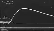 On March 10, 1894, Oliver and Schafer presented their findings to the Physiological Society in London.[11] A 47-page account followed a year later, in the style of the time without statistics, but with precise description of many individual experiments and 25 recordings on kymograph smoked drums, showing, besides the blood pressure increase, reflex bradycardia and contraction of the spleen.[12] "It appears to be established as the result of these investigations that the suprarenal capsules are to be regarded although ductless, as strictly secreting glands. The material which they form and which is found, at least in its fully active condition, only in the medulla of the gland, produces striking physiological effects upon the muscular tissue generally, and especially upon that of the heart and arteries. Its action is produced mainly if not entirely by direct action."