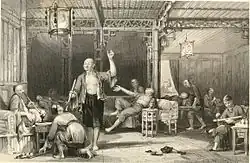The decree had little effect. By Qianlong's time opium had become a mainstream recreation among scholars and officials, and by the 1830s the practice had become widespread in cities. The increase in popularity was a result of both social and economic shifts between the Ming and the Qing dynasties in which there was a boost in commercialization, consumerism, and urbanization of opium within the general public.[22] “Opium,” says one recent scholar, became “leisurely, urban, cultured and a status symbol” as an evidence of wealth, leisure, and culture.[23] The Qing government, far away in Beijing, was unable to halt opium smuggling in the southern provinces. A porous Chinese border and rampant local demand facilitated the trade. By 1838 there were millions of Chinese opium users — opium was the main painkiller in a pre-aspirin age. Users were rendered listless, incapable workers, and the silver being sent abroad put pressure on the Chinese economy.[24] More and more Chinese were smoking British opium as a recreational drug. But for many, what started as recreation soon became a punishing addiction: many people who stopped ingesting opium suffered chills, nausea, and cramps, and sometimes died from withdrawal. Once addicted, people would often do almost anything to continue to get access to the drug.[25] Therefore, the Daoguang Emperor demanded action. Officials at the court who advocated legalizing and taxing the trade were defeated by those who advocated suppressing it. The Emperor sent the leader of the hard line faction, Special Imperial Commissioner Lin Zexu, to Canton, where he quickly arrested Chinese opium dealers and summarily demanded that foreign firms turn over their stocks with no compensation. When they refused, Lin stopped trade altogether and placed the foreign residents under virtual siege in their factories, eventually forcing the merchants to surrender their opium. Lin destroyed the confiscated opium in 1839, a total of some 1,000 long tons (1,016 t), a process which took 23 days.[26]