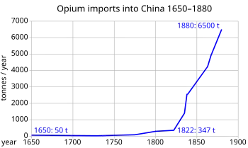 Imports of opium into China stood at 200 chests annually in 1729,[1] when the first anti-opium edict was promulgated.[2][3] By the time Chinese authorities reissued the prohibition in starker terms in 1799,[4] the figure had leaped; 4,500 chests were imported in the year 1800.[1] The decade of the 1830s witnessed a rapid rise in opium trade,[5] and by 1838, just before the First Opium War, it had climbed to 40,000 chests.[5] The rise continued on after the Treaty of Nanking (1842) that concluded the war. By 1858 annual imports had risen to 70,000 chests (4,480 long tons (4,550 t)), approximately equivalent to one year's worth of the total global production of opium between 1995 and 2005.[6]
