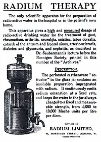 Many products which imitated emanation activators were more broadly marketed to the public. One such product was the Revigator, a "radioactive water crock." A dispensing jar made of radium-containing ore, the idea was that radon produced by the ore would dissolve in the water overnight. It was advertised: "Fill jar every night. Drink freely ... when thirsty and upon arising and retiring, average six or more glasses daily." The American Medical Association (AMA) was concerned that the public was being fleeced by charlatans. In response, the AMA established guidelines (in effect from 1916 to 1929) that emanators seeking AMA approval had to generate more than 2 μCi (74 kBq) of radon per liter of water in a 24-hour period. Most devices on the market, including the Revigator, did not meet that standard.[41]