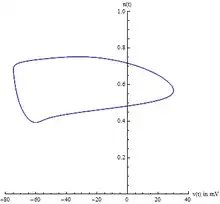 Because there are four state variables, visualizing the path in phase space can be difficult. Usually two variables are chosen, voltage and the potassium gating variable , allowing one to visualize the limit cycle. However, one must be careful because this is an ad-hoc method of visualizing the 4-dimensional system. This does not prove the existence of the limit cycle.
