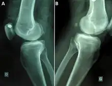 | Medio-lateralradiographsof knees joint showing a bilateral Hoffa fracture of the medial femoral condyle and fracture suspicion of left tibia plateau. (A) right knee; (B) left knee.[1] |