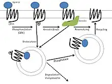 In contrast to receptor uncoupling, endocytosis can occur through multiple pathways. GPCR endocytosis has been shown to be either dependent or independent of arrestin activity, depending on the cell type used in the experiment; however, the former is more common. Furthermore, the same receptor expressed in two distinct cell types can be endocytosed through different mechanisms due to differences in GRK and arrestin expression: either through clathrin-coated vesicles or caveolae.[4] In general, receptor sequestration preferentially affects receptors that are both activated and phosphorylated, but the phosphorylation is not always a necessary component of endocytosis. After being sequestered, the affected receptors can either be degraded by lysosomes or reinserted into the plasma membrane, which is called receptor recycling.[5]