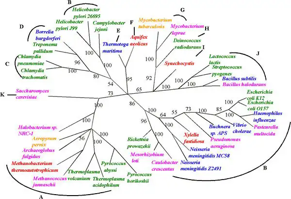 - ↑ Henz, S.; Huson, D.; Auch, A.; Nieselt-Struwe, K.; Schuster, S. (2005). "Whole-genome prokaryotic phylogeny". Bioinformatics. 21 (10): 2329–2335. doi:10.1093/bioinformatics/bth324. PMID 15166018.