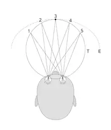 The term horopter was introduced by Franciscus Aguilonius in the second of his six books in optics in 1613.[5] In 1818, Gerhard Vieth argued from Euclidean geometry that the horopter must be a circle passing through the fixation-point and the nodal point of the two eyes. A few years later Johannes Müller made a similar conclusion for the horizontal plane containing the fixation point, although he did expect the horopter to be a surface in space (i.e., not restricted to the horizontal plane). The theoretical/geometrical horopter in the horizontal plane became known as the Vieth-Müller circle. However, see the next section Theoretical horopter for the claim that this has been the case of a mistaken identity for about 200 years.