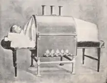 The human bake oven, also known as the Tallerman–Sheffield treatment,[1] Tallerman treatment[2] or Tallerman's apparatus,[3] was a Victorian era medical contraption used to treat various ailments, primarily joint problems such as rheumatism. Based on the knowledge that heat is often useful in alleviating pain, patients would be placed in the iron lung-like machine and then baked at temperatures typically around 138°C (280°F) but sometimes as high as 204°C (400°F). The sensation was variously described as either quite pleasant or feeling like one was being roasted alive.