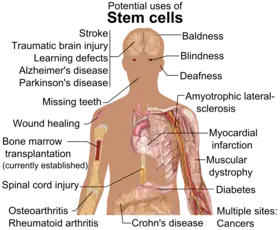 Cells produced with SCNT, or iPSCs could eventually be used in stem cell therapy,[25] or to create organs to be used in transplantation, known as regenerative medicine. Stem cell therapy is the use of stem cells to treat or prevent a disease or condition. Bone marrow transplantation is a widely used form of stem cell therapy.[26] No other forms of stem cell therapy are in clinical use at this time. Research is underway to potentially use stem cell therapy to treat heart disease, diabetes, and spinal cord injuries.[27][28] Regenerative medicine is not in clinical practice, but is heavily researched for its potential uses. This type of medicine would allow for autologous transplantation, thus removing the risk of organ transplant rejection by the recipient.[29] For instance, a person with liver disease could potentially have a new liver grown using their same genetic material and transplanted to remove the damaged liver.[30] In current research, human pluripotent stem cells have been promised as a reliable source for generating human neurons, showing the potential for regenerative medicine in brain and neural injuries.[31]
