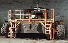 Windrow turner used on maturing piles at a biosolids composting facility in Canada.