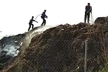Composting can destroy some pathogens and seeds, by reaching temperatures above 50 °C (122 °F).[23] Dealing with stabilized compost – i.e. composted material in which microorganisms have finished digesting the organic matter and the temperature has reached between 50 and 70 °C (122 and 158 °F) – poses very little risk, as these temperatures kill pathogens and even make oocysts unviable.[24] The temperature at which a pathogen dies depends on the pathogen, how long the temperature is maintained (seconds to weeks), and pH.[25]