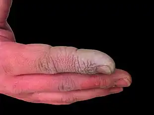 In addition to being a highly corrosive liquid, hydrofluoric acid is also a powerful contact poison. Since it can penetrate tissue, poisoning can occur readily through exposure of skin or eyes, inhalation, or ingestion. Symptoms of exposure to hydrofluoric acid may not be immediately evident, and this can provide false reassurance to victims, causing them to delay medical treatment.[24] Despite its irritating vapor, HF may reach dangerous levels without an obvious odor.[5] It interferes with nerve function, meaning that burns may not initially be painful. Accidental exposures can go unnoticed, delaying treatment and increasing the extent and seriousness of the injury.[24] Symptoms of HF exposure include irritation of the eyes, skin, nose, and throat, eye and skin burns, rhinitis, bronchitis, pulmonary edema (fluid buildup in the lungs), and bone damage[25] due to HF strongly interacting with calcium in bones.[26] In a concentrated form, HF can cause severe tissue destruction through lesions and mucous membrane damage, but dilute HF is still dangerous because of its high lipid affinity, leading to cellular death of nerves, blood vessels, tendons, bones, and other tissues.[27]