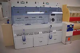 A 5% to 9% hydrofluoric acid gel is also commonly used to etch all ceramic dental restorations to improve bonding.[6] For similar reasons, dilute hydrofluoric acid is a component of household rust stain remover, in car washes in "wheel cleaner" compounds, in ceramic and fabric rust inhibitors, and in water spot removers.[5][7] Because of its ability to dissolve iron oxides as well as silica-based contaminants, hydrofluoric acid is used in pre-commissioning boilers that produce high-pressure steam. Hydrofluoric acid is also useful for dissolving rock samples (usually powdered) prior to analysis. In similar manner, this acid is used in acid macerations to extract organic fossils from silicate rocks. Fossiliferous rock may be immersed directly into the acid, or a cellulose nitrate film may be applied (dissolved in amyl acetate), which adheres to the organic component and allows the rock to be dissolved around it.[8]