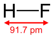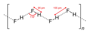 HF is diatomic in the gas-phase. As a liquid, HF forms relatively strong hydrogen bonds, hence its relatively high boiling point. Solid HF consists of zig-zag chains of HF molecules. The HF molecules, with a short covalent H–F bond of 95 pm length, are linked to neighboring molecules by intermolecular H–F distances of 155 pm.[4] Liquid HF also consists of chains of HF molecules, but the chains are shorter, consisting on average of only five or six molecules.[5]