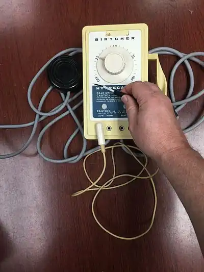 A hyfrecator is a low-powered medical apparatus used in electrosurgery on conscious patients, usually in an office setting. It is used to destroy tissue directly, and to stop bleeding during minor surgery. It works by emitting low-power high-frequency high-voltage AC electrical pulses, via an electrode mounted on a handpiece, directly to the affected area of the body. A continuous electric spark discharge may be drawn between probe and tissue, especially at the highest settings of power, although this is not necessary for the device to function. The amount of output power is adjustable, and the device is equipped with different tips, electrodes and forceps, depending on the electrosurgical requirement. Unlike other types of electrosurgery, the hyfrecator does not employ a dispersive electrode pad that is attached to the patient in an area not being treated, and that leads back to the apparatus (sometimes loosely but not quite correctly called a "ground pad"). It is designed to work with non-grounded (insulated) patients.