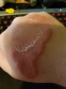 Hyperaemia (also hyperemia) is the increase of blood flow to different tissues in the body. It can have medical implications but is also a regulatory response, allowing change in blood supply to different tissues through vasodilation (widening of blood vessels). Clinically, hyperaemia in tissues manifests as erythema (redness of the skin) because of the engorgement of vessels with oxygenated blood.[1] Hyperaemia can also occur due to a fall in atmospheric pressure outside the body. The term comes from Greek ὑπέρ (hupér) 'over' and αἷμα (haîma) 'blood'.