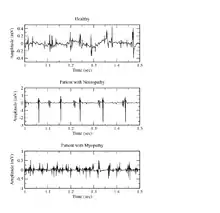 Studies have been done with electromyography to trace skeletal muscle activity in some hyperkinetic disorders. The electromyogram (EMG) of dystonia sometimes shows rapid rhythmic bursts, but these patterns can almost always be produced intentionally. In the myoclonus EMG, there are typically brief, and sometimes rhythmic, bursts or pauses in the recording pattern. When the bursts last for 50 milliseconds or less they are indicative of cortical myoclonus, but when they last up to 200 milliseconds, they are indicative of spinal or brainstem myoclonus. Such bursts can occur in multiple muscles simultaneously quite quickly, but high time resolution must be used in the EMG trace to clearly record them. The bursts recorded for tremor tend to be longer in duration than those of myoclonus, although some types can last for durations within the range for those of myoclonus. Future studies would have to examine the EMGs for tics, athetosis, stereotypies and chorea as there are minimal recordings done for those movements. However, it may be predicted that the EMG for chorea would include bursts varying in duration, timing, and amplitude, while that for tics and stereotypies would take on patterns of voluntary movements.[4]