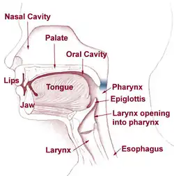 Hypernasal speech is a disorder that causes abnormal resonance in a human's voice due to increased airflow through the nose during speech. It is caused by an open nasal cavity resulting from an incomplete closure of the soft palate and/or velopharyngeal sphincter (velopharyngeal insufficiency).[1] In normal speech, nasality is referred to as nasalization and is a linguistic category that can apply to vowels or consonants in a specific language. The primary underlying physical variable determining the degree of nasality in normal speech is the opening and closing of a velopharyngeal passageway between the oral vocal tract and the nasal vocal tract. In the normal vocal tract anatomy, this opening is controlled by lowering and raising the velum or soft palate, to open or close, respectively, the velopharyngeal passageway.