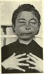 | Hyperplasia of midface with bulbous fingers in leontiasis ossea | |