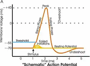 At resting potential, both the voltage gated sodium and potassium channels are closed but as the cell membrane becomes depolarized the voltage gated sodium channels begin to open up and the neuron begins to depolarize, creating a current feedback loop known as the Hodgkin cycle.[2] However, potassium ions naturally move out of the cell and if the original depolarization event was not significant enough then the neuron does not generate an action potential. If all the sodium channels are open, however, then the neuron becomes ten times more permeable to sodium than potassium, quickly depolarizing the cell to a peak of +40 mV.[2] At this level the sodium channels begin to inactivate and voltage gated potassium channels begin to open. This combination of closed sodium channels and open potassium channels leads to the neuron re-polarizing and becoming negative again. The neuron continues to re-polarize until the cell reaches ~ –75 mV,[2] which is the equilibrium potential of potassium ions. This is the point at which the neuron is hyperpolarized, between –70 mV and –75 mV. After hyperpolarization the potassium channels close and the natural permeability of the neuron to sodium and potassium allows the neuron to return to its resting potential of –70 mV. During the refractory period, which is after hyper-polarization but before the neuron has returned to its resting potential the neuron is capable of triggering an action potential due to the sodium channels ability to be opened, however, because the neuron is more negative it becomes more difficult to reach the action potential threshold.