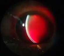 Hyphema is the medical condition of bleeding in the anterior chamber of the eye between the iris and the cornea.[1] People usually first notice a loss or decrease in vision.[1] The eye may also appear to have a reddish tinge, or it may appear as a small pool of blood at the bottom of the iris in the cornea. A traumatic hyphema is caused by a blow to the eye.[1] A hyphema can also occur spontaneously.[2]