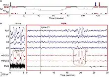 - ↑ Merica H, Fortune RD (December 2004). "State transitions between wake and sleep, and within the ultradian cycle, with focus on the link to neuronal activity". Sleep Med Rev. 8 (6): 473–85. doi:10.1016/j.smrv.2004.06.006. PMID 15556379.