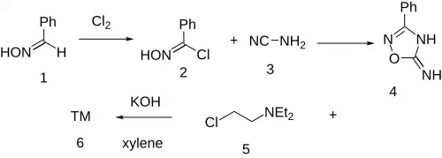 The reaction of benzoylchloride oxime [698-16-8] (2) with Cyanamide (3) gives 3-Phenyl-1,2,4-oxadiazol-5-amine [3663-37-4] (4). Alkylation with 2-chlorotriethylamine [100-35-6] (5) in the presence of KOH base occurs at the endocyclic ring nitrogen completing the synthesis of imolamine (6).