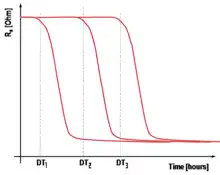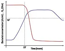 In Fig. 2 a typical curve for Rs as well as the corresponding bacterial concentration are plotted vs. time. Fig. 3 shows typical Rs curves vs time for samples characterized by different bacterial concentration. Since DT is the time needed for the bacterial concentration to grow from the initial value C0 to CTH, highly contaminated samples are characterized by lower values of DT than samples with low bacterial concentration. Given C1, C2 and C3 the bacterial concentration of three samples with C1 > C2 > C3, it is DT1 < DT2 < DT3. Data from literature show how DT is a linear function of the logarithm of C0:[10][11]