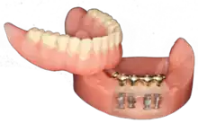 There are many types of implant bars, including this Kugel B Bar. Implant bars are a mix between dentures and implants. Unlike common dentures, a bar is implanted in the patient's mouth, and the denture snaps onto the bar to hold it in place. These are generally made of acrylic with the higher-quality bars using natural-looking teeth and gums.