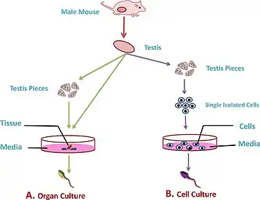 In fragment cultures, the testis is removed and fragments of tissue are cultured in supplemental media containing different growth factors to induce spermatogenesis and form functional gametes.[2] The development of this culture technique has taken place mainly with the use of animal models e.g. mice or rat testis tissue.