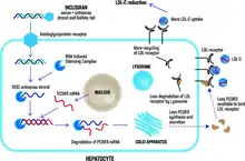 The proprotein convertase, PCSK9, is a liver-produced and -secreted serine protease whose binding and action on LDL receptors results in their increased lysosomal degradation in hepatocytes, a consequence of which is an increase in the level of circulating LDL cholesterol (and inhibition of which, the decrease in this level).[10] Studies of PCSK9 genetics supported the conclusion that decreases in circulating LDL cholesterol accomplished in this way would result in "diminished cardiovascular risk... with no apparent negative health consequences", and long term administration of antibodies with short in vivo half-lives, 1-2 times a month, reduced circulating PCSK9 and LDL cholesterol levels, with the result of a "lower incidence of cardiovascular events than placebo".[10] Together, these results contributed to the validation of PCSK9-targeting siRNAs for development as a new therapeutic for use in LDL cholesterol–lowering therapy; specifically, small interfering RNA (siRNA) molecules of appropriate sequence and structure were sought and discovered as a means of decreasing PCSK9 levels, and the development of a clinical candidate ensued thereafter.[10]