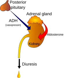In the absence of diabetes mellitus, the most common causes are the decreased secretion of aldosterone due to adrenal cortical tumor, primary polydipsia (excessive fluid drinking), central diabetes insipidus, and nephrogenic diabetes insipidus.[6] Polyuria may also be due to various chemical substances, such as diuretics, caffeine, and ethanol. It may also occur after supraventricular tachycardias, during an onset of atrial fibrillation, childbirth, and the removal of an obstruction within the urinary tract. Diuresis is controlled by antidiuretics such as vasopressin, angiotensin II and aldosterone. Cold diuresis is the occurrence of increased urine production upon exposure to cold, which also partially explains immersion diuresis. High-altitude diuresis occurs at altitudes above 10,000 feet (3,000 m) and is a desirable indicator of adaptation to high altitudes. Mountaineers who are adapting well to high altitudes experience this type of diuresis. People who produce less urine even in the presence of adequate fluid intake are probably not adapting well to high altitudes.[10]