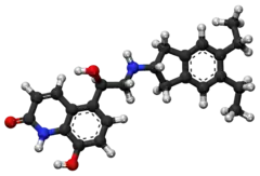 Indacaterol is an ultra-long-acting beta-adrenoceptor agonist[5] developed by Novartis. It needs to be taken only once a day,[6] unlike the related drugs formoterol and salmeterol. It is licensed only for the treatment of chronic obstructive pulmonary disease (COPD) (long-term data in patients with asthma are thus far lacking). It is delivered as an aerosol formulation through a dry powder inhaler.