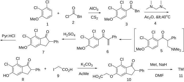 The Friedel-Crafts acylation of 2,3-dichloroanisole [1984-59-4] (1) with phenylacetyl chloride [103-80-0] (2) gives 2,3-dichloro-4-phenylacetylanisole [59043-83-3] (3). A variation of the Mannich reaction is performed employing tetramethyldiaminomethane [51-80-9] (this is an aminal of dimethylamine and formaldehyde). The intermediate reaction product (5), which is not isolated, would undergo a β-Hydride elimination with concomitant loss of dimethylamine and formation of the corresponding enone, 2,3-Dichloro-4-(2-phenylacryloyl)anisole (PC10924810) (6). Acid catalyzed (H2SO4) intramolecular cyclization gives the indanone (PC10990444) (7). This is O-demethylated under acidic conditions to give 2-Phenyl-5-hydroxy-6,7-dichloro-1-indanone, PC12774089 (8). The phenol thus obtained is then alkylated on oxygen by iodoacetic acid [64-69-7] (9) affording PC20520826 (10). Alkylation with iodomethane [74-88-4] in the presence of sodium hydride completed the synthesis of indacrinone (11).