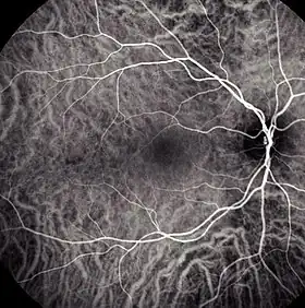 Indocyanine green angiography (ICGA) is a diagnostic procedure used to examine choroidal blood flow and associated pathology. Indocyanine green (ICG) is a water soluble cyanine dye which shows fluorescence in near-infrared (790–805 nm) range, with peak spectral absorption of 800-810 nm in blood.[1][2] The near infrared light used in ICGA penetrates ocular pigments such as melanin and xanthophyll, as well as exudates and thin layers of sub-retinal vessels.[3] Age-related macular degeneration is the third main cause of blindness worldwide, and it is the leading cause of blindness in industrialized countries.[4] Indocyanine green angiography is widely used to study choroidal neovascularization in patients with exudative age-related macular degeneration.[5] In nonexudative AMD, ICGA is used in classification of drusen and associated subretinal deposits.[5]