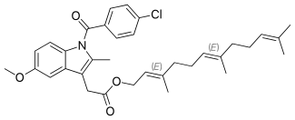 Indometacin farnesil (INN) is a prodrug of the nonsteroidal anti-inflammatory drug (NSAID) indometacin,[1] designed to reduce the occurrence of side-effects by esterification of the carboxyl group on indometacin with farnesol. Indometacin farnesil was first approved in Japan in 1991, and is available in Japan[2] and Indonesia, under the trade names Infree and Dialon, respectively.
