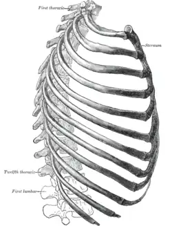 The lower opening of the thorax is formed by the twelfth thoracic vertebra behind, by the eleventh and twelfth ribs at the sides, and in front by the cartilages of the tenth, ninth, eighth, and seventh ribs, which ascend on either side and form an angle, the infrasternal angle or subcostal angle, into the apex of which the xiphoid process projects.