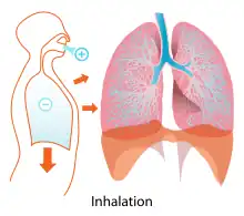 The inflow of air into the lungs occurs via the respiratory airways. In health, these airways begin with the nose.[3][4] It is possible to begin with the mouth, which is the backup breathing system. However, chronic mouth breathing leads to, or is a sign of, illness, and it does not have mucus in the mouth to trap the unwanted substance unlike the nostrils[5][6][7] They end in the microscopic dead-end sacs(alveoli) always opened, though the diameters of the various sections can be changed by the sympathetic and parasympathetic nervous systems. The alveolar air pressure is therefore always close to atmospheric air pressure (about 100 kPa at sea level) at rest, with the pressure gradients that cause air to move in and out of the lungs during breathing rarely exceeding 2–3 kPa.[8][9]